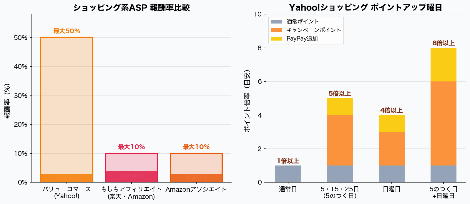 左:ショッピング系ASP報酬率比較 / 右:Yahoo!ショッピング ポイントアップ曜日